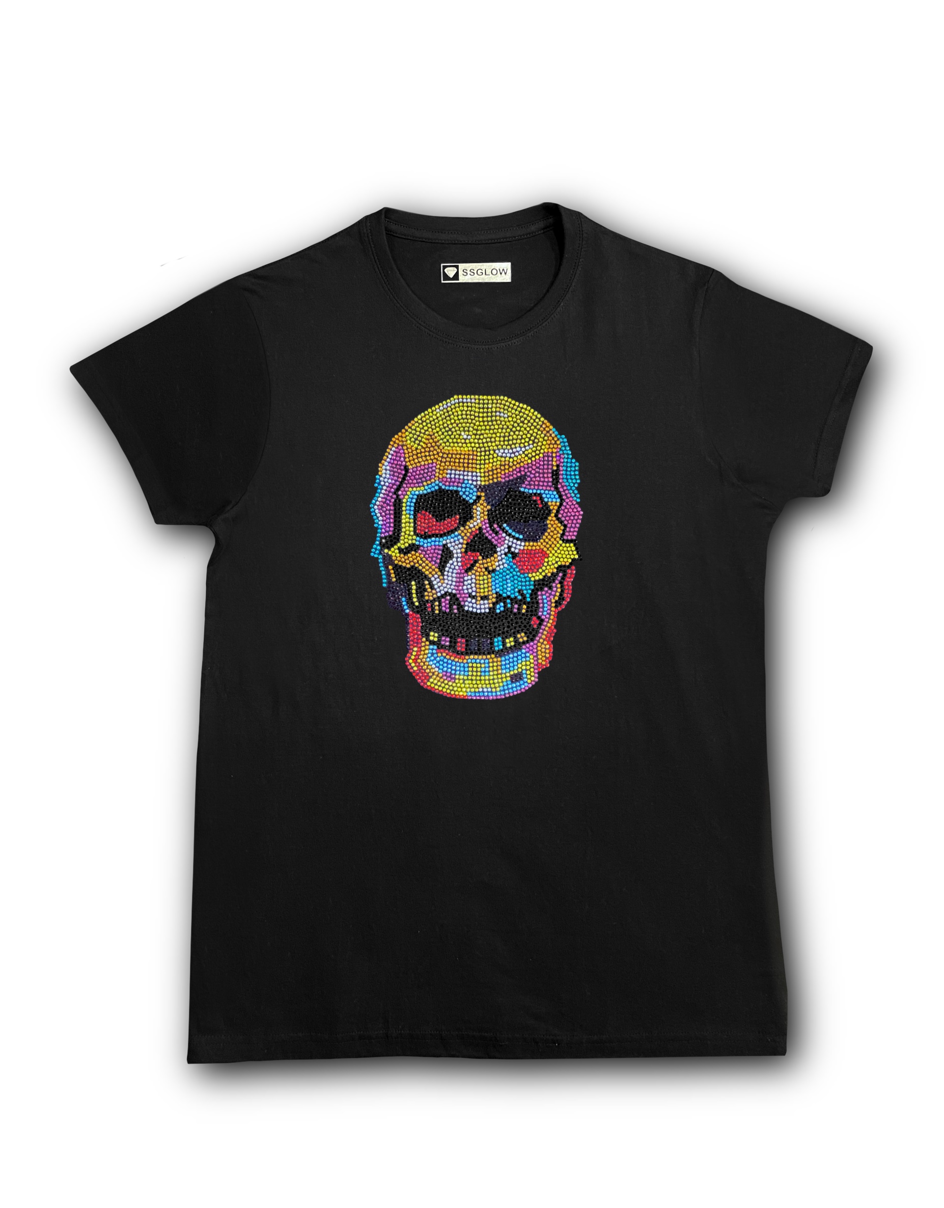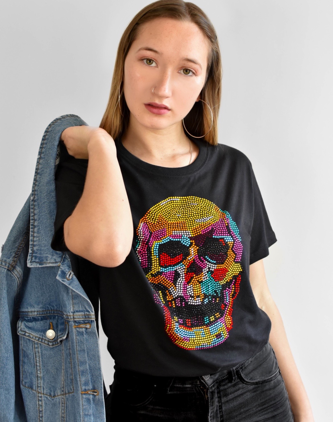 Polera manga corta 100% algodón de la más alta calidad y estampado de pedrería de diamantes único en Chile, colocándolos one by one como obra de arte, dántote ese estilo auténtico que necesitas.